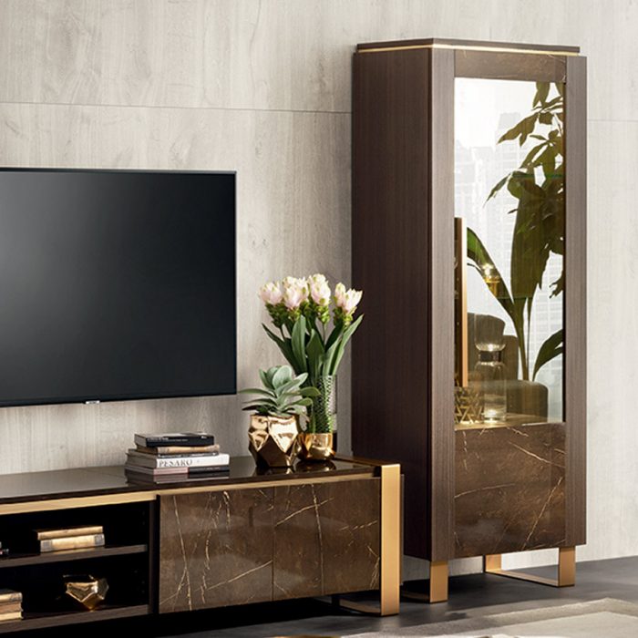 The style of Essenza’s curio cabinets is summarized in their variety of materials, finishes and refined textures. The satin-finished gilded metal strips support the verticality of the furniture, while the wenge wood and marble finish match perfectly with the reflections of bronzed or transparent glass. Characteristics that make these curio cabinets a true celebration of the modern style.