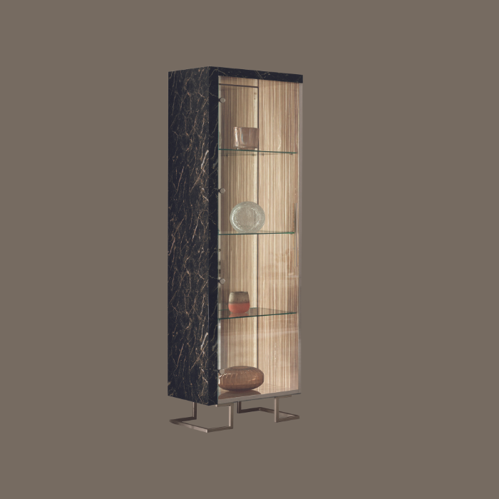 A TV wall stand is key in a modern and functional living room. Luce Dark offers a versatile and refined composition featuring three furniture elements: two side display cases and a central TV stand cabinet, united by the same materials, champagne-colored geometric feet and a consistent and harmonious color palette.